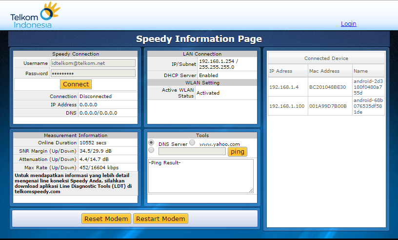 Teman-teman bisa login via browser apapun dengan alamat standart di http://modem.telkom atau di 192.168.1.254 (default)